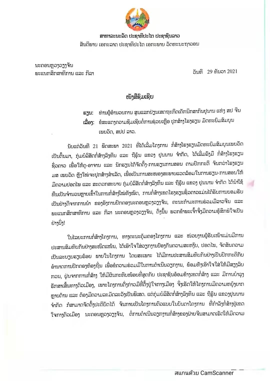 近日,援老撾萬象市皮瓦中學(xué)項目先后獲得老中合作委員會、老撾萬象市教育與體育廳兩個重要領(lǐng)導(dǎo)部門的感謝、表揚信。