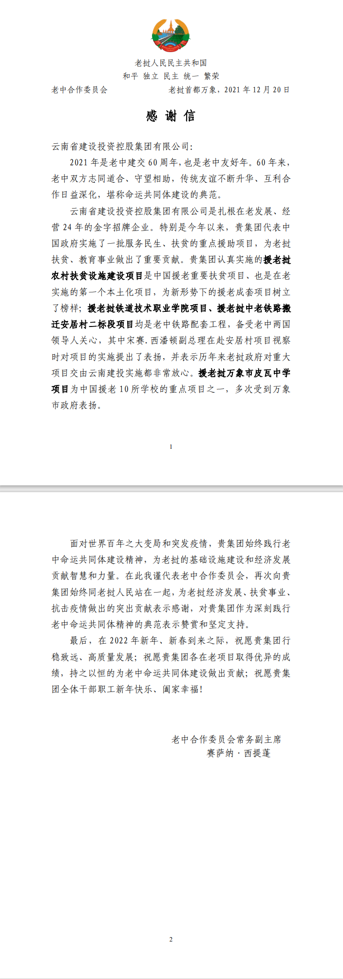 老中合作委員會寫給集團(tuán)的感謝信中提到,援老撾萬象市皮瓦中學(xué)項目為中國援老10所學(xué)校的重點項目之一,多次受到萬象市政府表揚。面對世界百年之大變局和突發(fā)疫情,集團(tuán)始終踐行老中命運共同體建設(shè)精神,為老撾的基礎(chǔ)設(shè)施建設(shè)和經(jīng)濟(jì)發(fā)展貢獻(xiàn)智慧和力量。老中合作委員會向集團(tuán)的突出貢獻(xiàn)表示感謝,對集團(tuán)作為深刻踐行老中命運共同體精神的典范表示贊賞和堅定支持。