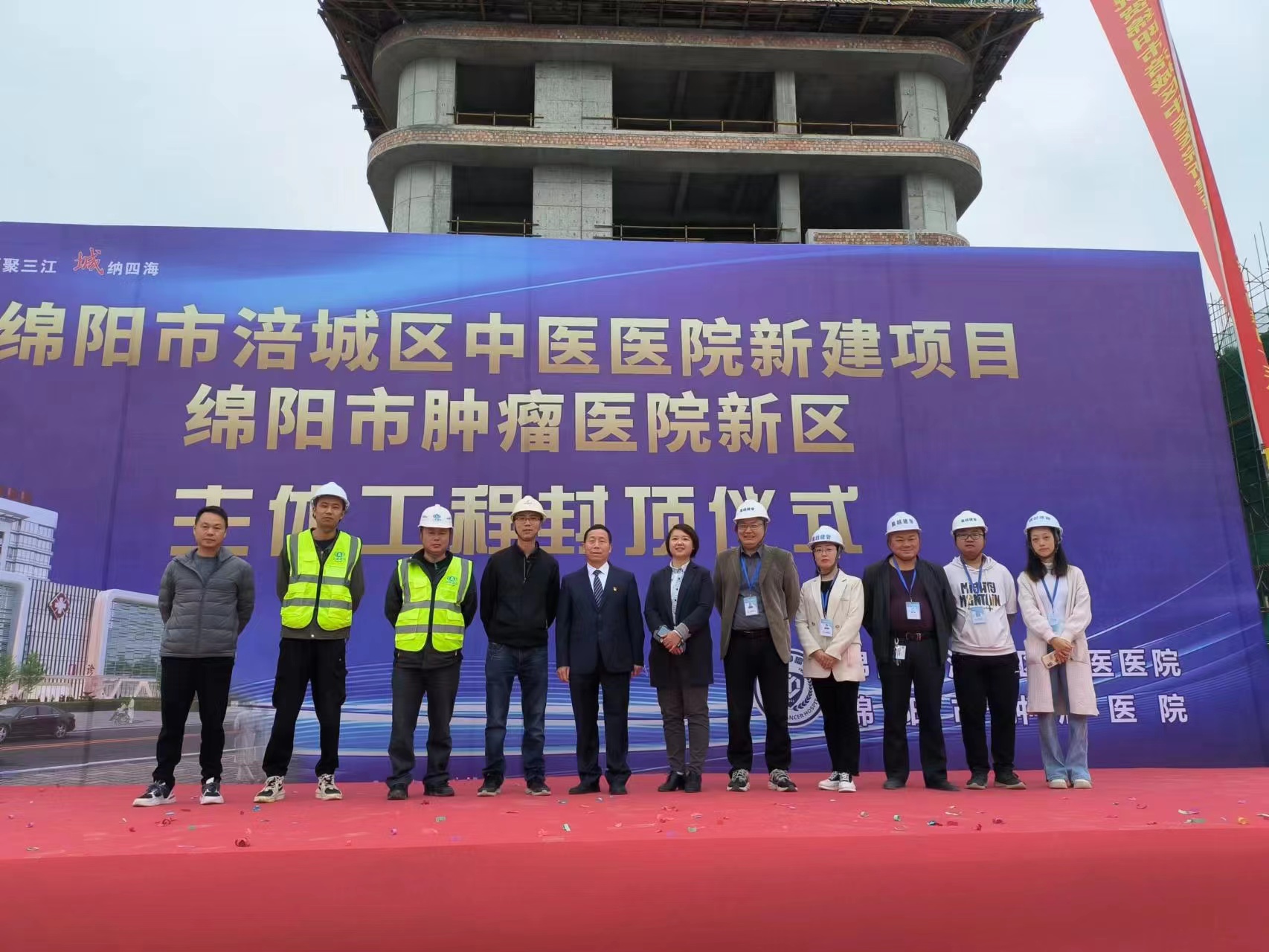 10月11日上午,施工現(xiàn)場(chǎng),彩旗飄飄,鞭炮齊鳴,掌聲雷動(dòng),在大家共同見證下,隨著住院樓屋面板最后一方混凝土澆筑完成,由省外事業(yè)部承建的綿陽市涪城區(qū)中醫(yī)醫(yī)院新建項(xiàng)目順利封頂。