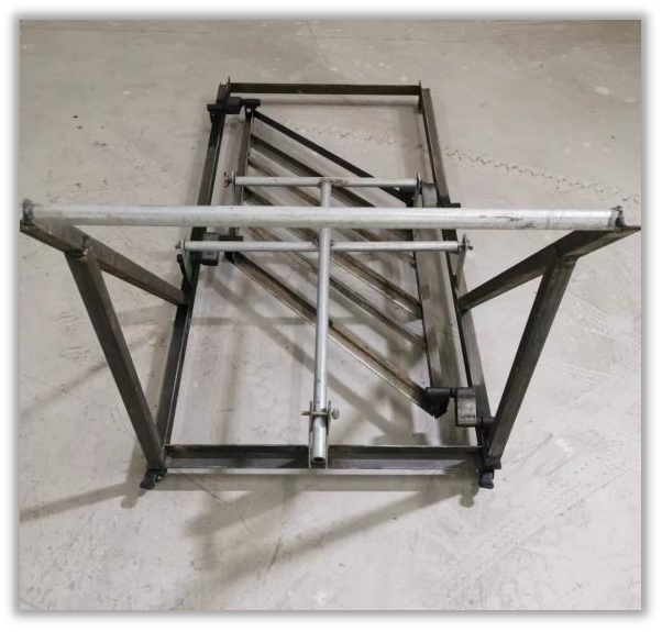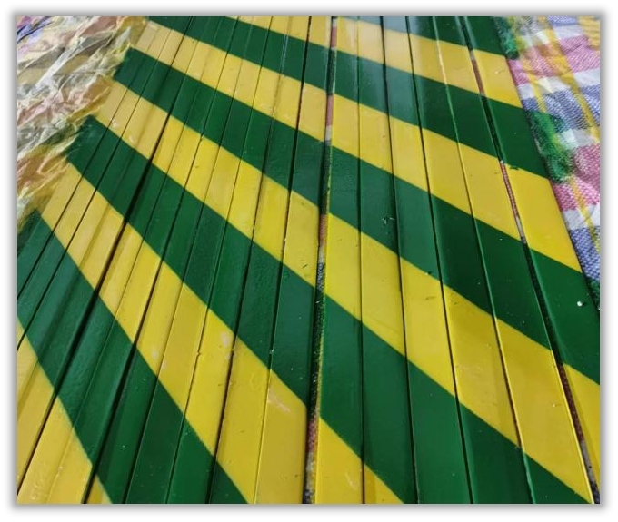 本工程地下室包括106臺(tái)風(fēng)機(jī)機(jī)組,為提高接地扁鋼整體觀感,項(xiàng)目部自主研制接地扁鐵色標(biāo)加工噴涂模具,采用30*3角鋼焊制成45°(135°)500mm*600mm的菱形邊框(可根據(jù)實(shí)際需求調(diào)整大小),在邊框兩側(cè)焊上提耳和腳踏板,然后在框內(nèi)每隔100mm設(shè)置一道寬100mm分隔板,最后在磨具底部接觸面安裝一層橡膠或其他柔性材料,防止噴涂油漆時(shí)因磨具與扁鐵接觸面不緊密導(dǎo)致串色、分隔線條模糊。
