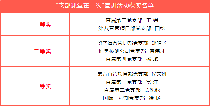 此項(xiàng)活動(dòng)從4月底持續(xù)到6月中旬,共有29家黨支部參加。公司領(lǐng)導(dǎo)、現(xiàn)場(chǎng)聽(tīng)眾、黨委工作部人員從形象風(fēng)度、語(yǔ)言表達(dá)、主題內(nèi)容、綜合印象、宣講時(shí)長(zhǎng)等方面綜合評(píng)審,最終評(píng)出一等獎(jiǎng)2名,二等獎(jiǎng)3名,三等獎(jiǎng)4名,并于7月1日在“奮進(jìn)新時(shí)代 獻(xiàn)禮二十大”慶“七一”主題黨日活動(dòng)中對(duì)獲獎(jiǎng)的黨支部書(shū)記進(jìn)行表彰。