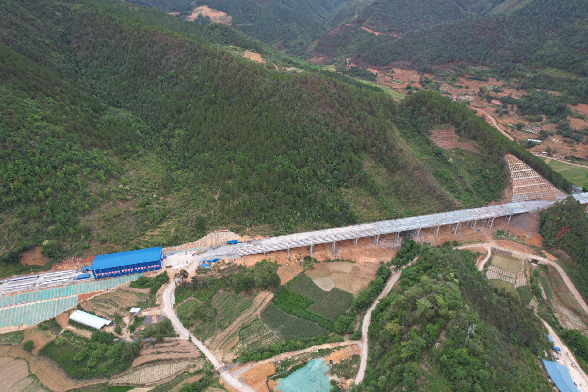 古寧高速土建四分部施工段位于云南省麗江市古城區(qū)南側(cè),路線起點順接鶴關(guān)高速關(guān)坡樞紐互通,途經(jīng)壽南村、三元村、貴峰村、大獵村、美自村、啟可村、達瓦村、止于上啟良村東南側(cè),主線長8.3km、路線全長10.49 km,橋梁9座/4761m、隧道1座/1665m、互通1座。